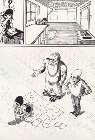 It's only during this thunderstorm that she realizes that her favorite professor is actually Death himself (because everyone wears a mask in the necropolis) but the lightening and crack of thunder jars her "waking" life and she sees things for what they are after that . . . (reminiscent of Borges Circular Ruins here with Mr. Death looking for a few good men /women to help him alter the legal scene). The reader was already aware of his true identity, since Mr. Death appears with a skeletal face on the frames where he addresses the reader directly with quips such as "And now I'll use the F-word: Fair," and "It's almost time for the ritual slaying of the elders."